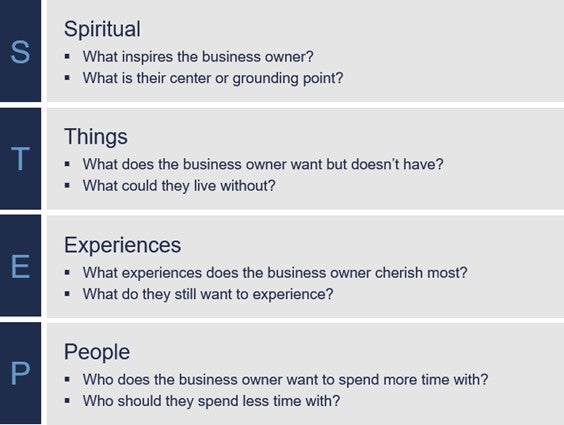 For many, the business was their primary purpose and identity, and after it’s sold, the absence can be disorienting.5 Introducing the S.T.E.P. framework (spiritual, things, experiences, people) can help clients define goals that reflect their values and create a vision for life after the exit.