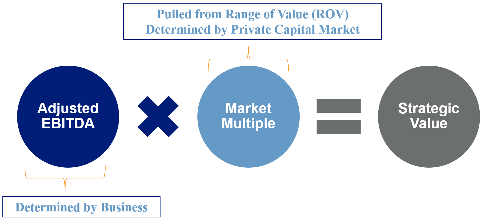 The strategic value calculation provides a planning estimate of what a business may be worth. It begins with adjusted EBITDA (earnings before interest, taxes, depreciation and amortization), a common metric used to gauge a company’s operational performance. From there, a market multiple is applied—derived from private‑market data and influenced by the business’s attractiveness, readiness for ownership transfer and level of risk.